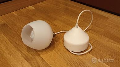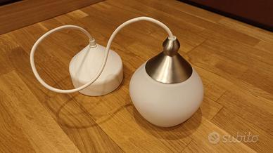 Lampadario a pallina in vetro satinato bianco con attacco in acciaio satinato, filo e calotta coprifili color bianco, usato pochissimo. Prezzo Euro: 20.00