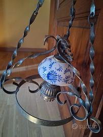 Lampadario a soffitto , struttura in ferro battuto a torciglione e diffusore in ceramica decorata con motivi floreali blu, periodo fabbricazione tra gli anni 50 e 70. stile rustico.