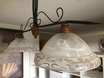 Lampadario a due luci in ferro battuto e vetro decorato.