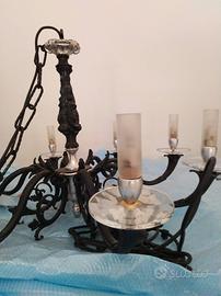 Lampadario a sospensione con struttura in fusione feltro di ottone e argento che sorregge n. 8 bracci in ottone finemente decorati, su cui poggiano 8 luci (attacco per lampadine Led G9 e potenza massima 42W) a forma di cilindro in vetro satinato. Il design tipicamente barocco rende il prodotto ideale per illuminare salotti, studi e camere da letto di case arredate in maniera classica.