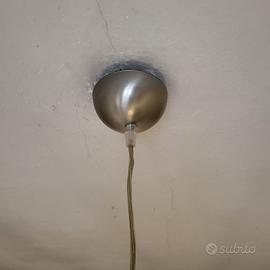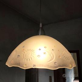 Lampadario a sospensione vintage con paralume a cupola in vetro satinato decorato con soli, lune e stelle colorate in rilievo. Montatura in metallo satinato. Stile modernariato risalente agli anni '80/'90, prodotto in Italia, in ottime condizioni di conservazione. Attacco per lampadina standard E27. Misure: Diametro 40 cm Altezza da soffitto 120 cm altezza paralume 25 cm