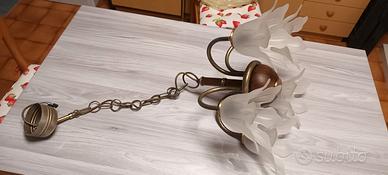 Lampadario a sospensione d'antiquariato con paralumi in vetro satinato a forma di fiore e struttura in metallo ottone e legno.