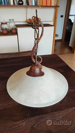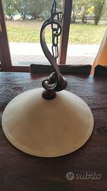 Descrizione: Lampadario a sospensione con catena in ferro battuto e grande diffusore circolare in vetro satinato. Perfetto per illuminare un tavolo da pranzo o una cucina in stile arte povera/country. La catena permette di regolare l'altezza. Vetro integro e struttura solida.