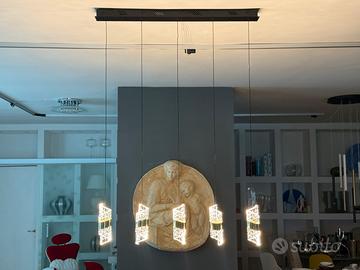 Vendo raffinato lampadario a sospensione composto da 5 moduli pendenti in cristallo, dal design moderno ed elegante. Ogni elemento è realizzato in vetro lavorato con taglio geometrico e rifiniture a spirale, impreziosito da una fascia centrale in metallo cromato nero lucido che dona un tocco di classe e contemporaneità.