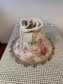 Elegante lampadario in stoffa in perfette condizioni e pari al nuovo. Struttura in metallo con copertura in stoffa Decorazioni in corda e frange pendenti Misure: Diametro piu' grande del cappello: 50 cm Altezza: 28 cm Lunghezza cavo in corda: 175 cm Portalampada E27 (Grande)