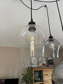 Lampadario a sospensione 5 luci in vetro di varie tipologie: riflettente, fumè e trasparente.