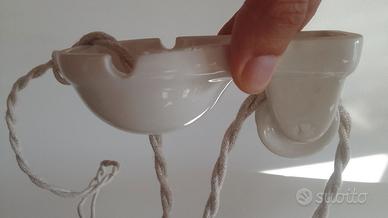 Lampadario a sospensione in metallo con rosone e contrappeso in ceramica bianca, completo di lampadina led a globo 24w luce calda. Cavo elettrico intrecciato bianco vintage. Perfette condizioni.