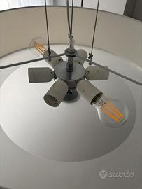 Lampadario a sospensione con montatura in cromo. Paralume in lamina di PVC rivestita in tessuto colore bianco. Sul fondo, diffusore in vetro trasparente sabbiato. Sospensioni con cavi a lunghezza regolabile.