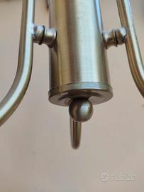 Vendo lampadario a soffitto in ottone satinato con tre bracci. In ottime condizioni e provvisto di gancio di ancoraggio. Altezza totale 57 cm, diametro 40 cm. Alimentazione con tre prese E14 per lampadine piccole. No spedizione solo ritiro in zona stadio a Firenze o a Borgo San Lorenzo (FI). Lorenzo 3282288879
