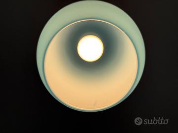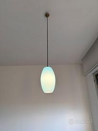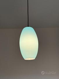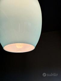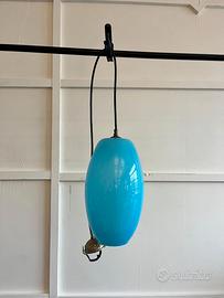 Lampada a sospensione con diffusore in vetro azzurro opalino, dal design elegante e leggero. Diffonde una luce morbida e uniforme, ideale per soggiorno, cucina, camera o studio.