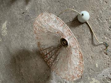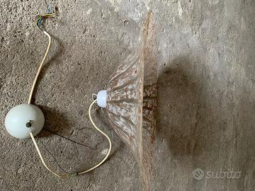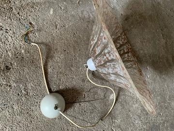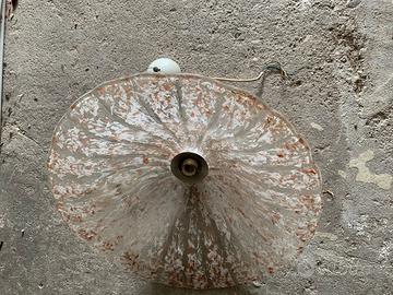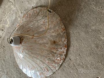 Per rinnovo locali vendo bellissimo ed importante lampadario a sospensione in vetro a forma di cappello opportunamente serigrafato e lavorato come in foto, misura alla base di 55 cm, altezza circa 20 cm e parte superiore 20 cm; le serigrafie preminentemente sono di colore marrone, bianco e grigio. Un cappello dalle linee sinuose che danno un tocco di eleganza agli ambienti sia classici che contemporanei, corpo a luce diffusa.