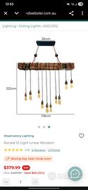 Lampadario a sospensione stile industrial / vintage, realizzato con trave in legno massello e 10 portalampade con cavi pendenti regolabili. Design molto scenografico, ideale per ambienti moderni, loft, open space, cucina, sala da pranzo, bar o locale commerciale.