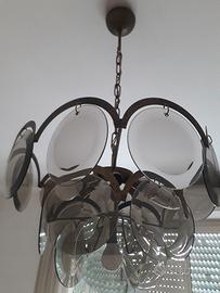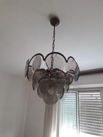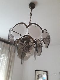 lampadario a sospensione Vistosi per Venini, in ottone, con dischi in vetro di murano, colore fumè, articolo vintage.
