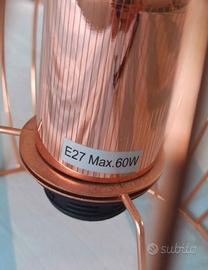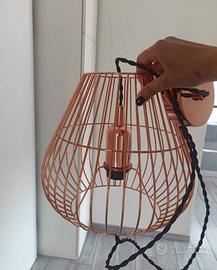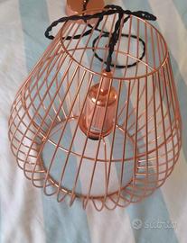 Lampadario in stile industriale. Realizzato in metallo, con paralume a forma di gabbia. Color rame