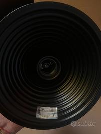 Il lampadario è caratterizzato da linee geometriche e pulite, perfette per ambienti contemporanei, cucine, sale da pranzo, uffici o open space. È composto da una struttura a cono nera con una raffinata lavorazione ad anelli concentrici (sia sul corpo lampada che sul rosone a soffitto) e da un ampio disco in vetro che alleggerisce il design e diffonde la luce in modo ottimale.