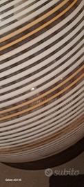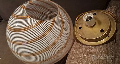 Bellissimo e introvabile lampadario di grandi dimensioni degli anni 60/70 con vetro murano sferico con righe a spirale Venini, 1 punto Luce ad attacco grande E27, diam 40 cm x 40 cm altezza circa, circonferenza 125 cm, filo sospensione. Incantevole quando acceso grazie all'effetto a spirale.