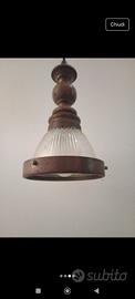 Lampadario a sospensione in vetro, metallo e legno anni 70 stile industrial