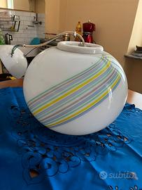 Lampadario a sospensione x cameretta, in vetro bianco con righe colorate, diametro 40 cm x 35 cm di altezza