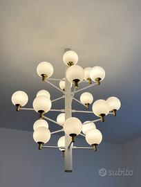 Vendo lampadario a sospensione dal design vintage e moderno. •Materiale: Metallo bianco satinato •Lampade: LED G9 incluse •Sfere: Vetro soffiato incamiciato Perfetto per salotto, cucina o camera da letto.