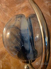 Il diffusore sferico è realizzato in vetro trasparente con una caratteristica decorazione interna in vetro blu e bianco lattimo sfumato, modellata a onda, un chiaro riferimento alla cifra stilistica naturalistica di Zuccheri, che spesso si ispirava a forme organiche e motivi acquatici.