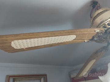 lampadario con tre punti luce inseriti in portalampade di vetro opalino a forma di fiore. 4 Pale in legno con decori paglia di Venezia. struttura in metallo dorato. il ventilatore si aziona a cordicella. adatto per ambienti medio/grandi, misure diametro 90cm, altezza 50cm. Molto decorativo, effetto vintage chic.