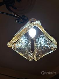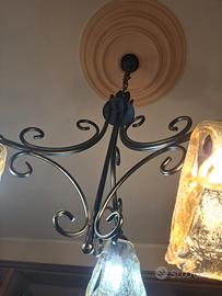 lampadario in vetro e ferro battuto, con coppe con forma particolare. a 3 luci.