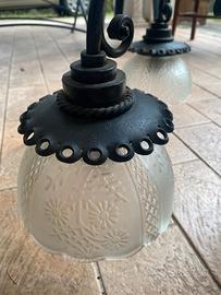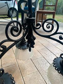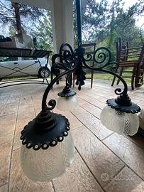 Lampadario in ferro battuto ricamato nero con tre lampade in vetro decorate con fiori