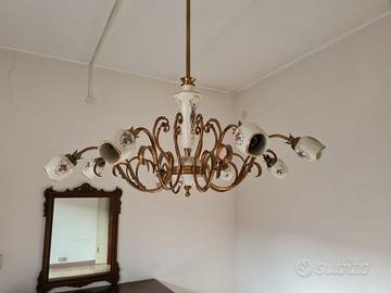 Lampadario anni 40' a 8 bracci, in ceramica dipinta a mano. Perfettamente funzionante.