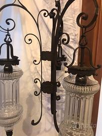 Lampadario in ferro battuto e vetro molato anni 50’ Struttura in ferro battuto nero e sospensione con catena Ps: manca il terzo componente in vetro per questo motivo il prezzo è basso