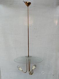 Lampadario a tre lampade, in ottone e vetro, i paralumi sono in lamierino color avorio. Ricorda lo stile "Paolo Chiesa".