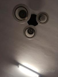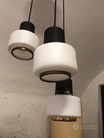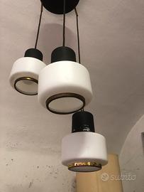 Lampadario anni 50 stile Stilnovo con tre vetri pendenti con bordino in ottone. Buone condizioni.