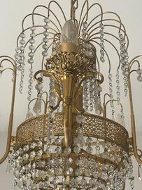 Vendo lampadario con struttura in ottone dorato e pendenti in cristallo molato. Composto da 6 bracci luce con cascata centrale di cristalli. Molto scenografico, ideale per salone o sala da pranzo. Perfettamente funzionante Smontaggio e ritiro a carico dell’acquirente a Nibionno o Lecco