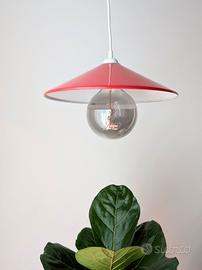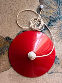 Lampadario a sospensione anni '70, con un design che richiama il mid-century. Struttura in metallo rosso. Dimensione: Diametro 35 cm, altezza circa 8 cm. Lunghezza Cavo 175 cm. Lampadina non compresa.