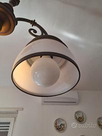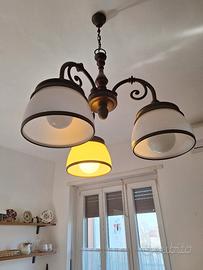 Lampadario con 3 bracci in bronzo e porta lampada in vetro bianco opaco.