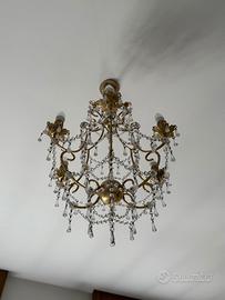 Lampadario anni Cinquanta in ottone con gocce di cristallo