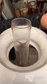 Lampadario originale d’epoca, risalente probabilmente al periodo 1885–1910, nato come lampada a petrolio e successivamente elettrificato nei primi del Novecento. Struttura in ottone/bronzo fuso con ricchi motivi floreali di gusto tardo eclettico–Liberty. Sospensione a tre catene con elemento superiore decorato e anello portante circolare originale. Decori traforati e modanature realizzati in fusione, non stampati, con buona qualità esecutiva. Paralume a campana in vetro opalino bianco, originale d’epoca, in ottimo stato conservativo. Corpo centrale in vetro opalino tornito. Camino in vetro trasparente inciso con motivo decorativo (probabile simbolo araldico stilizzato), anch’esso coevo. La lampada conserva la struttura del bruciatore a petrolio con ghiera traforata tipica della fine dell’Ottocento; l’elettrificazione è stata eseguita successivamente, come di consuetudine per questo tipo di oggetti. Impianto attuale funzionante. Condizioni generali molto buone per l’età: patina naturale dell’ottone, leggere ossidazioni coerenti, nessuna rottura strutturale, vetri integri. Oggetto autentico d’epoca, non riproduzione moderna. Ideale per ambienti d’epoca, case di campagna, studi professionali, ristoranti o arredamenti classici e vintage. Prezzo adeguato alla qualità e alla completezza del pezzo. Visibile a Roma.