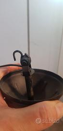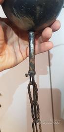 Lampadario antico in ferro battuto, stile medievale. Particolare portalampada in rame.