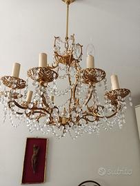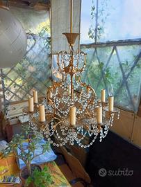 lampadario anni 70 , made in italy da artigianato Bolognese , con 10 candele portalampade e catenine di quarzi come in foto ,misura 58 di diametro e 60 di altezza + 25 di asta , la struttura e finemente lavorata e placcato oro. Le lampadine non sono incluse ne ho 3 a goccia originali, ma adesso a se ne trovano diversi tipi a Led a fiamma opache ecc..ecc. Disponibile per ritiro a mano a Ravenna o spedizione Bartolini è l'unico