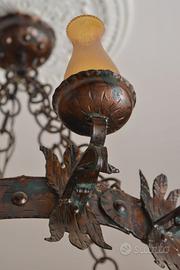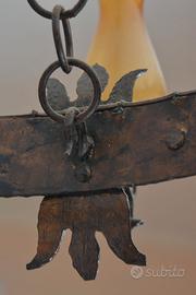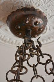 Stile e Periodo: Lo stile richiama l'estetica del periodo medievale o del primo Rinascimento, con elementi che ricordano i lampadari a corona o "a cerchio" tipici di quei secoli, spesso arricchiti da decorazioni in ferro battuto o, come in questo caso, in bronzo.
