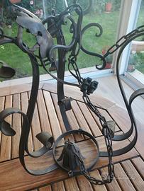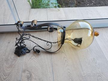 Lampadario ferro battuto antico 1 lume, con ampilla in vetro soffiato color ambra peso circa 2 kg.
