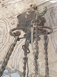 Lampadario antico in ferro . Bellissimo lampadario a 4 luci con lavorazioni a mano . I vetri sono integri . Dimensioni : 75 x 65 x 100 altezza .