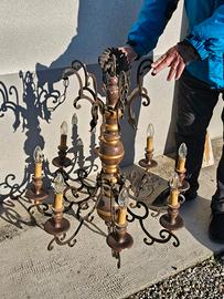 Vendo elegante lampadario antico perfettamente funzionante in legno tornito e metallo lavorato (la struttura presenta segni di ossidazione verde essendo totalmente in ottone)