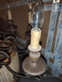 Vendo elegante lampadario antico perfettamente funzionante in legno tornito e metallo lavorato (la struttura presenta segni di ossidazione verde essendo totalmente in ottone) Periodo primi del ’900 (anni 20 o 30). Articolo rilevato da una abitazione del 1928. La struttura è importante ma armoniosa, con bracci in metallo decorati e corpo centrale in legno massiccio. Dimensioni: Altezza: circa 110 cm Parte centrale diametro: 50–60 cm Condizioni: Lampadario perfettamente Funzionante Presenta normali segni di usura del tempo, che non pregiudicano né la stabilità né l’estetica complessiva. Considerato l’insieme, è da ritenersi in buono stato.