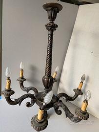 Lampadario in legno primi anni del XX secolo. Altezza cm.89, larghezza cm.70. Condizioni: buone, inevitabili segni del tempo. Deve essere rinnovato l’impianto e alcuni incollaggi.