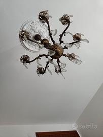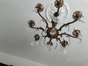 Vendo elegante lampadario antico in ottone con pendenti in vetro/cristallo lavorato. Stile classico, ideale per salotti, camere da letto o ambienti con arredamento vintage/antiquariato.