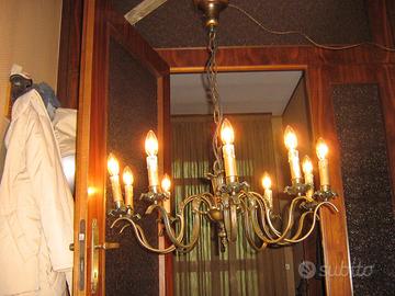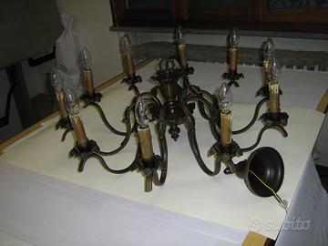 lampadario antico in ottone con 10 bracci portalampada, diametro esterno cm.75, altezza totale da sotto al soffitto cm.90, è stato completamente smontato pezzo per pezzo, ripulito, rifatto l'impianto elettrico e rimontato, completo di 10 lampade a risparmio energetico da 18w corrispondenti ciascuna come luce emessa ad una lampadina ad incandescenza da 25w, può illumunare una stanza di 20 metri quadri, vendo a e.290, ritiro e trasporto a carico del compratore oppure posso spedire con pacco postale in contrassegno costo 20 euro
