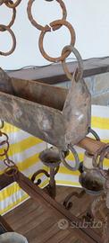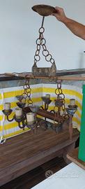 lampadario antico in ferro battuto, lamine di rame, e bronzo sei luci in legno con impianto elettrico a piattina due fili e 6 porta candele, epoca sconosciuta fine 800 inizi 900. il tutto come da foto, misure 60x72 larghezza e h 100 circa. pesa circa 20 kg. viste le dimensioni ed il peso si consiglia ritiro di persona o eventuale spedizione con ritiro in loco a vostre spese.