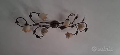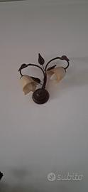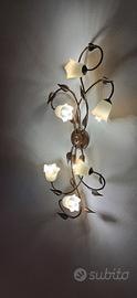 vendo un lampadario + 2 applique + 2 abatjour stile floreale classico con struttura in metallo colore bronzo e dettagli decorativi a foglie, paralumi in vetro satinato a forma di fiore.