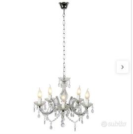 Lampadario composto da una struttura metallica rivestita in acrilico trasparente, dotata di 5 rami a forma di arco di cerchio, decorati con pendenti, stoppini e 5 portacandele che ricordano la forma di una candela. Il tutto è sostenuto da una catena in metallo cromato e rifinito con un rosone cromato.