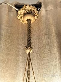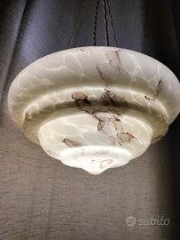 Lampadario Art Decò il vetro opalino marmorizzato design a gradini il corpo e sorretto da tre corde intrecciate e il rosone in corda altezza totale della lampadario 90 diametro boccia 30 altezza boccia 14